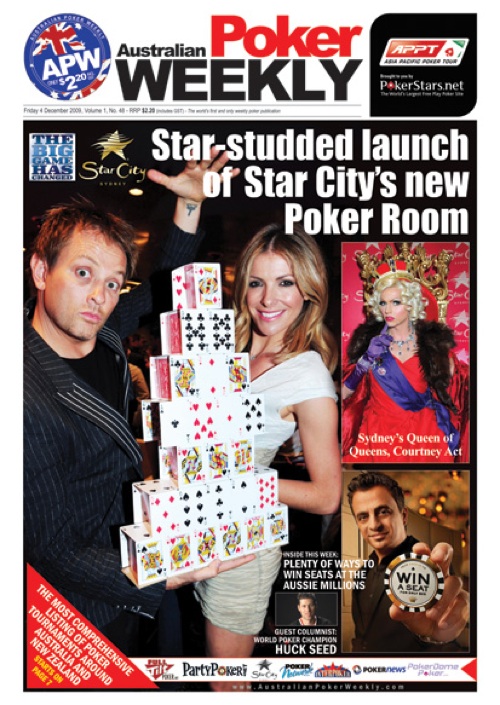 Im gonna lay my royal flush down on the table and let people know, Poker is my life my life is Poker. I’m sure Marcia Heinz wrote a song about that once when she had one, late one night when she had to many lemonGRASS teas. Very happy about making the front cover of the Australian Poker Weekly and I have to say Its about time. Not because I hosted the highest rating Poker TV show of all time in Australia with Lee Final tables Nelson but more for the amount of unsuspecting people who I’ve met at the tables of various casinos across australia and told bad jokes to while they took my hard earned money. Truth is, I love the game, but have an extremely short attention span. So when It comes to hosting poker tournaments at home or on the telle Im having a ball and enjoying the game with everyone around me, but when it comes to winning, I suck. I suck so bad. Although I did make it to the top 20 at Shane Warnes recent tournament at Crown casino amongst some real poker pros. Hey I even beat Warnie that day. Check out the new poker room at Star City, its by far the best in Australia. Just beware Grant Levy and Toothpick Tony, they ALWAYS bluff. I know from experience.